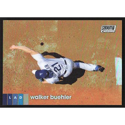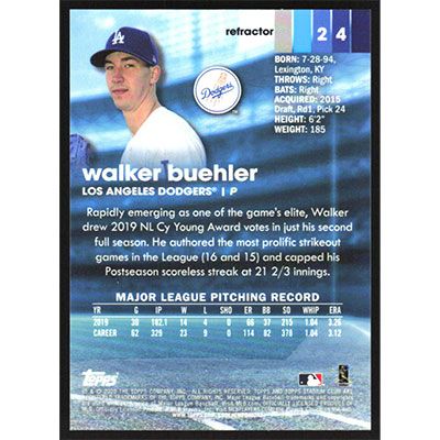 This is a 2020 Stadium Club Chrome Insert Refractors Walker Buehler baseball card. The card is #24 and pictures show condition. Team(s): Los Angeles Dodgers