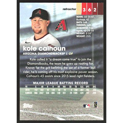 This is a 2020 Stadium Club Chrome Refractors Kole Calhoun baseball card. The card is #362 and pictures show condition.
