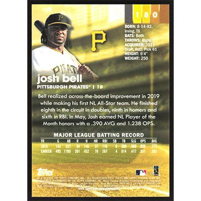 This is a 2020 Stadium Club Chrome X-Fractors Josh Bell baseball card. The card is #180 and pictures show condition.