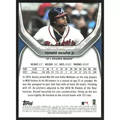 This is a 2020 Stadium Club In the Wings Ronald Acuña Jr. baseball card. The card is #ITW-1 and pictures show condition.