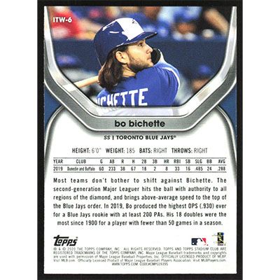 This is a 2020 Stadium Club In the Wings Bo Bichette baseball card. The card is #ITW-6 and pictures show condition. Team(s): Toronto Blue Jays Rookie Card (RC)