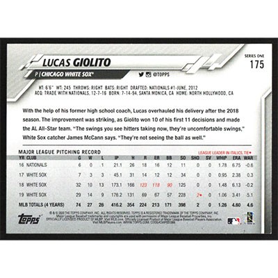 This is a 2020 Topps Lucas Giolito baseball card. The card is #175 and pictures show condition.