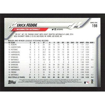 This is a 2020 Topps Erick Fedde baseball card. The card is #198 and pictures show condition.