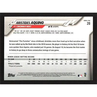This is a 2020 Topps Aristides Aquino autographed baseball card. This card has been signed, in blue, by Aristides Aquino, and is guaranteed authentic by Ballcardz.com. The card is #20 and pictures show condition.