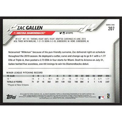 This is a 2020 Topps Zac Gallen baseball card. The card is #207 and pictures show condition.