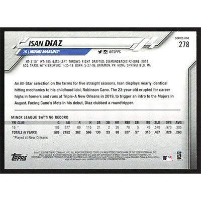 This is a 2020 Topps Isan Diaz baseball card. The card is #278 and pictures show condition.