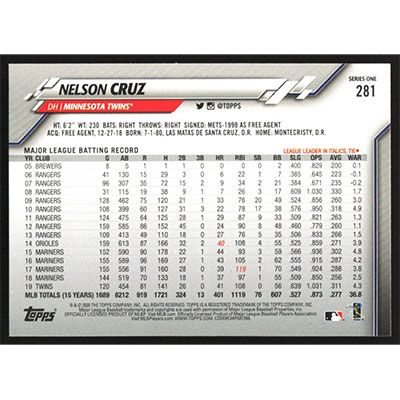 This is a 2020 Topps Nelson Cruz baseball card. The card is #281 and pictures show condition.