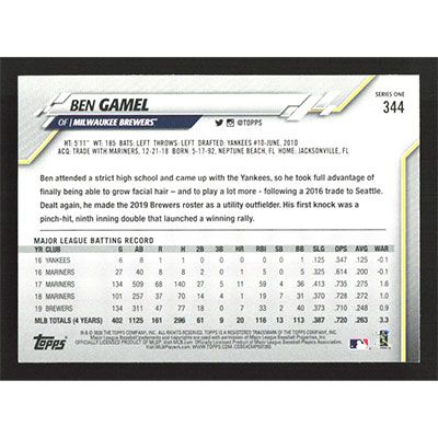 This is a 2020 Topps Ben Gamel baseball card. The card is #344 and pictures show condition.