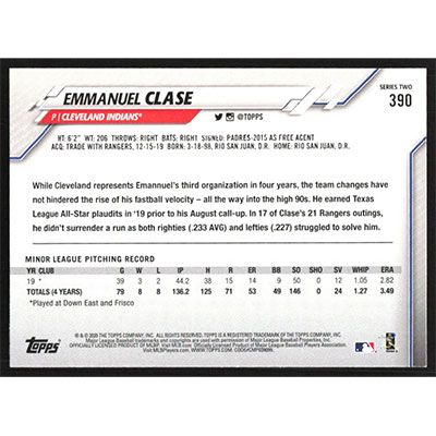 This is a 2020 Topps Emmanuel Clase baseball card. The card is #390 and pictures show condition.