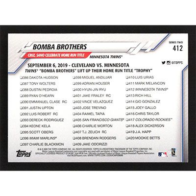 This is a 2020 Topps Nelson Cruz and Miguel Sano Bomba Brothers Checklist baseball card. The card is #412 and pictures show condition. Team(s): Minnesota Twins