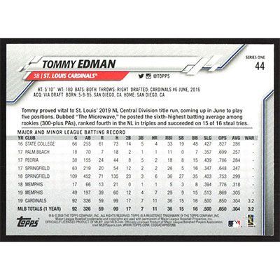 This is a 2020 Topps Tommy Edman Future Stars baseball card. The card is #44 and pictures show condition.