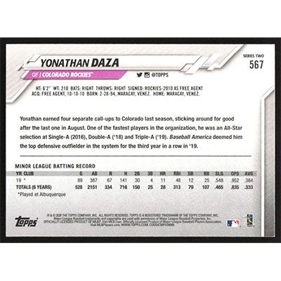 This is a 2020 Topps Yonathan Daza baseball card. The card is #567 and pictures show condition.