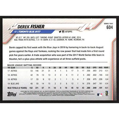 This is a 2020 Topps Derek Fisher baseball card. The card is #604 and pictures show condition.