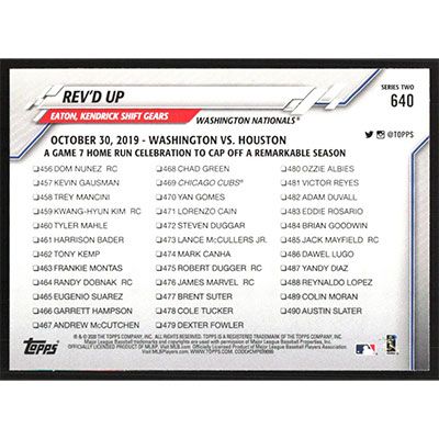 This is a 2020 Topps Adam Eaton and Howie Kendrick Rev'd Up Checklist baseball card. The card is #640 and pictures show condition. Team(s): Washington Nationals