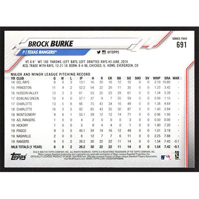 This is a 2020 Topps Brock Burke baseball card. The card is #691 and pictures show condition.