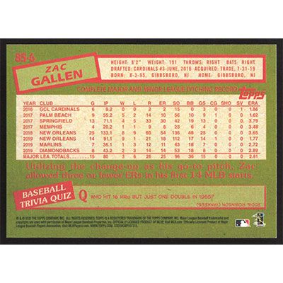 This is a 2020 Topps '85 Zac Gallen baseball card. The card is #85-6 and pictures show condition.
