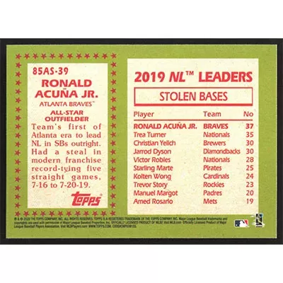 This is a 2020 Topps '85 All-Stars Ronald Acuña Jr. baseball card. The card is #85AS-39 and pictures show condition.