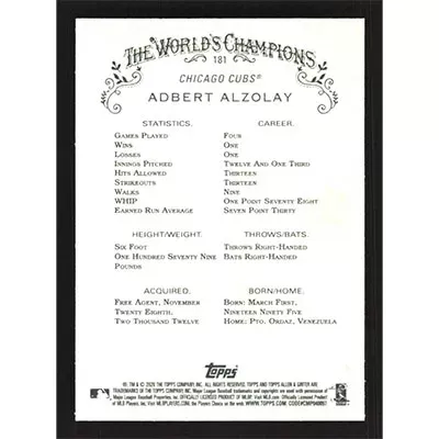 This is a 2020 Topps Allen & Ginter Adbert Alzolay baseball card. The card is #181 and pictures show condition.