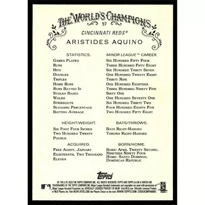 This is a 2020 Topps Allen & Ginter Aristides Aquino baseball card. The card is #97 and pictures show condition. Team(s): Cincinnati Reds Rookie Card (RC)