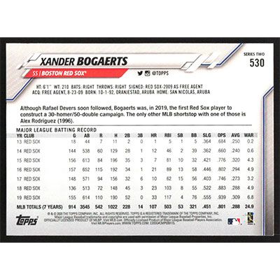 This is a 2020 Topps Base Set Photo Variations Xander Bogaerts Tuxedo baseball card. The card is #530 and pictures show condition. Team(s): Boston Red Sox