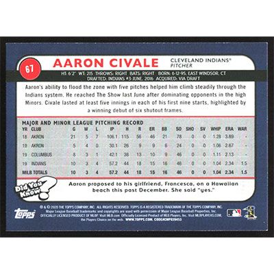 This is a 2020 Topps Big League Aaron Civale baseball card. The card is #67 and pictures show condition.
