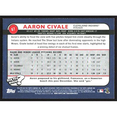 This is a 2020 Topps Big League Orange Aaron Civale baseball card. The card is #67 and pictures show condition. Team(s): Cleveland Indians Rookie Card (RC)
