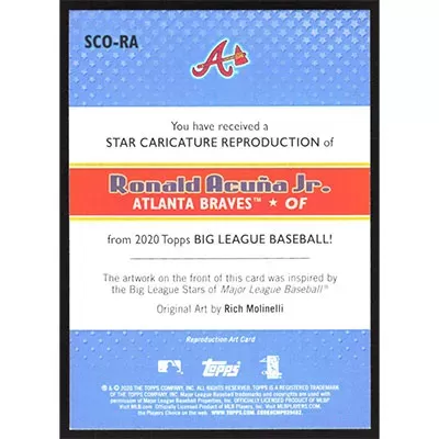 This is a 2020 Topps Big League Star Caricature Reproductions Ronald Acuña Jr. baseball card. The card is #SCO-RA and pictures show condition. Team(s): Atlanta Braves