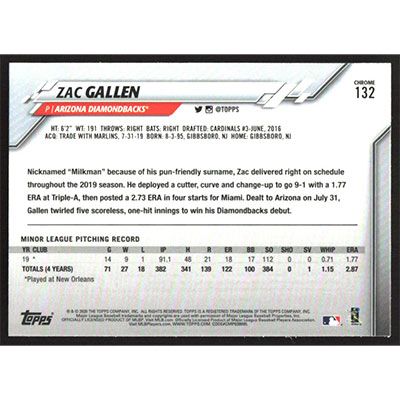 This is a 2020 Topps Chrome Zac Gallen baseball card. The card is #132 and pictures show condition.