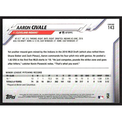 This is a 2020 Topps Chrome Aaron Civale baseball card. The card is #143 and pictures show condition.