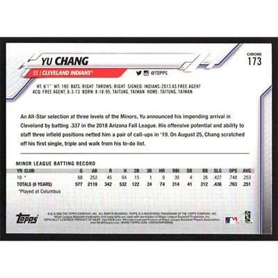 This is a 2020 Topps Chrome Yu Chang baseball card. The card is #173 and pictures show condition.