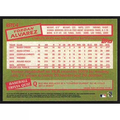This is a 2020 Topps Chrome '85 Yordan Alvarez baseball card. The card is #85TC-4 and pictures show condition. Team(s): Houston Astros Rookie Card (RC)