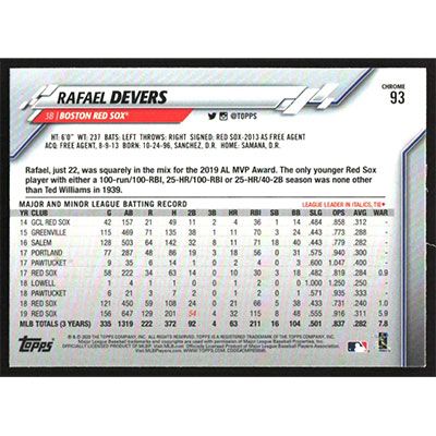 This is a 2020 Topps Chrome Rafael Devers baseball card. The card is #93 and pictures show condition.