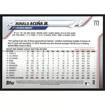 This is a 2020 Topps Chrome Ben Baller Ronald Acuña Jr. baseball card. The card is #112 and pictures show condition.