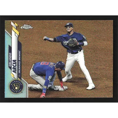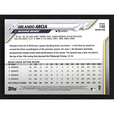 This is a 2020 Topps Chrome Refractors Orlando Arcia baseball card. The card is #140 and pictures show condition.