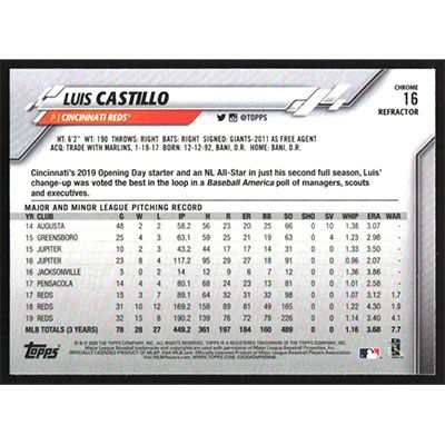 This is a 2020 Topps Chrome Refractors Luis Castillo baseball card. The card is #16 and pictures show condition.