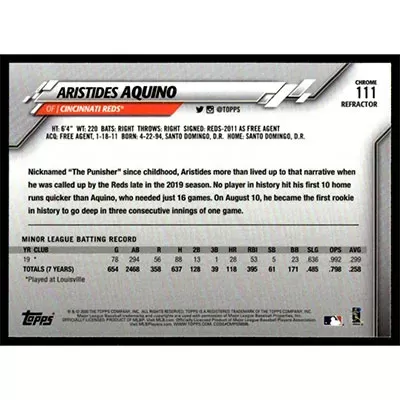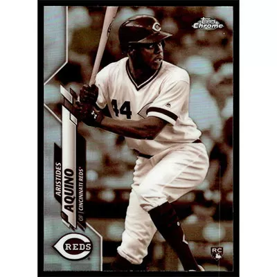 This is a 2020 Topps Chrome Sepia Refractors Aristides Aquino baseball card. The card is #111 and pictures show condition. Team(s): Cincinnati Reds Rookie Card (RC)