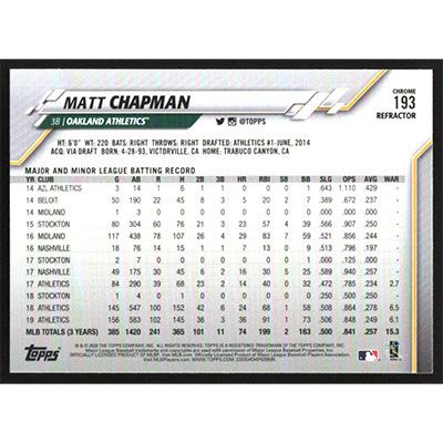 This is a 2020 Topps Chrome Sepia Refractors Matt Chapman baseball card. The card is #193 and pictures show condition.