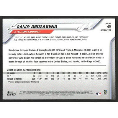 This is a 2020 Topps Chrome Sepia Refractors Randy Arozarena baseball card. The card is #49 and pictures show condition. Team(s): St. Louis Cardinals Rookie Card (RC)