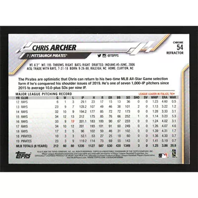 This is a 2020 Topps Chrome Sepia Refractors Chris Archer baseball card. The card is #54 and pictures show condition.