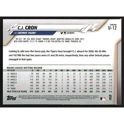 This is a 2020 Topps Chrome Update C.J. Cron baseball card. The card is #U-12 and pictures show condition.
