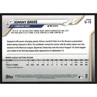 This is a 2020 Topps Chrome Update Johnny Davis baseball card. The card is #U-18 and pictures show condition. Team(s): Tampa Bay Rays Rookie Card (RC)