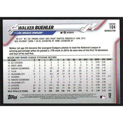 This is a 2020 Topps Chrome X-Fractors Walker Buehler baseball card. The card is #104 and pictures show condition.
