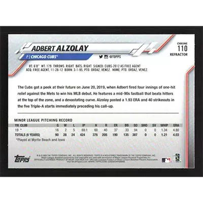 This is a 2020 Topps Chrome X-Fractors Adbert Alzolay baseball card. The card is #110 and pictures show condition. Team(s): Chicago Cubs Rookie Card (RC)