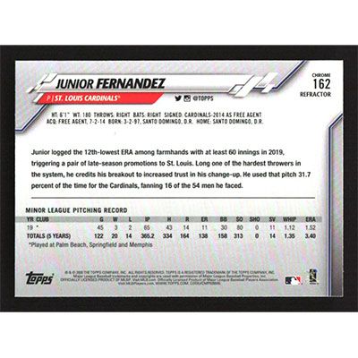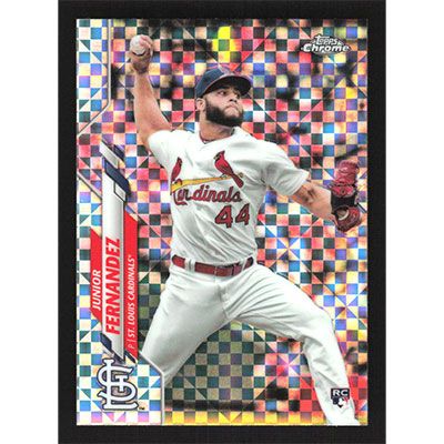 This is a 2020 Topps Chrome X-Fractors Junior Fernandez baseball card. The card is #162 and pictures show condition. Team(s): St. Louis Cardinals Rookie Card (RC)