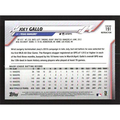 This is a 2020 Topps Chrome X-Fractors Joey Gallo baseball card. The card is #191 and pictures show condition.