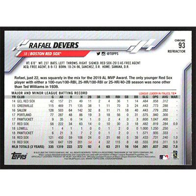 This is a 2020 Topps Chrome X-Fractors Rafael Devers baseball card. The card is #93 and pictures show condition.