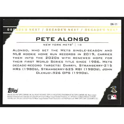 This is a 2020 Topps Decade's Next Pete Alonso baseball card. The card is #DN-11 and pictures show condition.