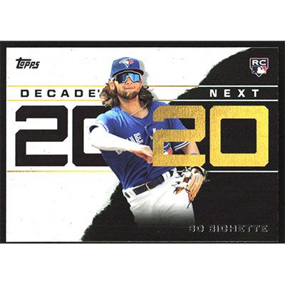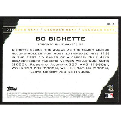 This is a 2020 Topps Decade's Next Bo Bichette baseball card. The card is #DN-13 and pictures show condition. Team(s): Toronto Blue Jays Rookie Card (RC)