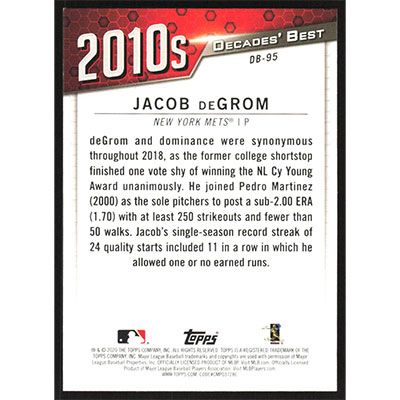 This is a 2020 Topps Decades' Best Jacob deGrom baseball card. The card is #DB-95 and pictures show condition.