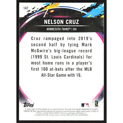 This is a 2020 Topps Fire Nelson Cruz baseball card. The card is #147 and pictures show condition.